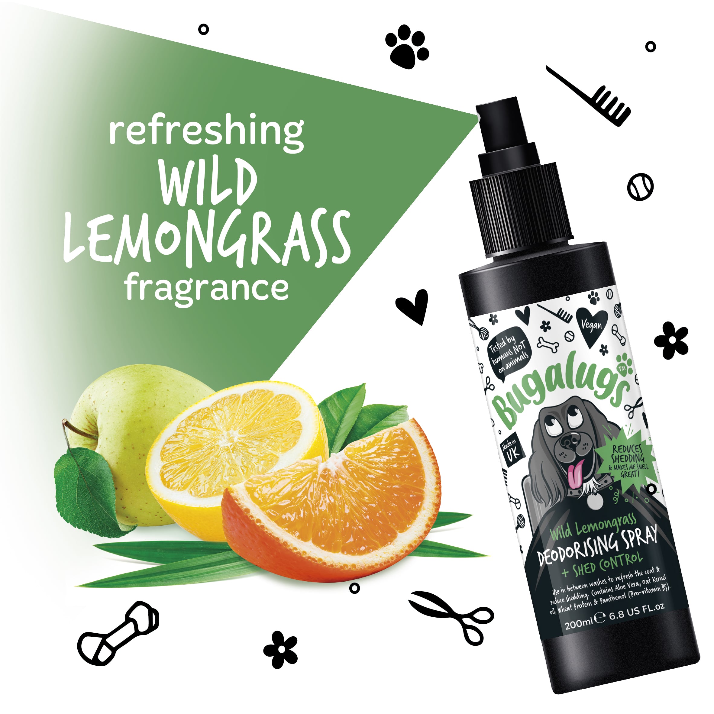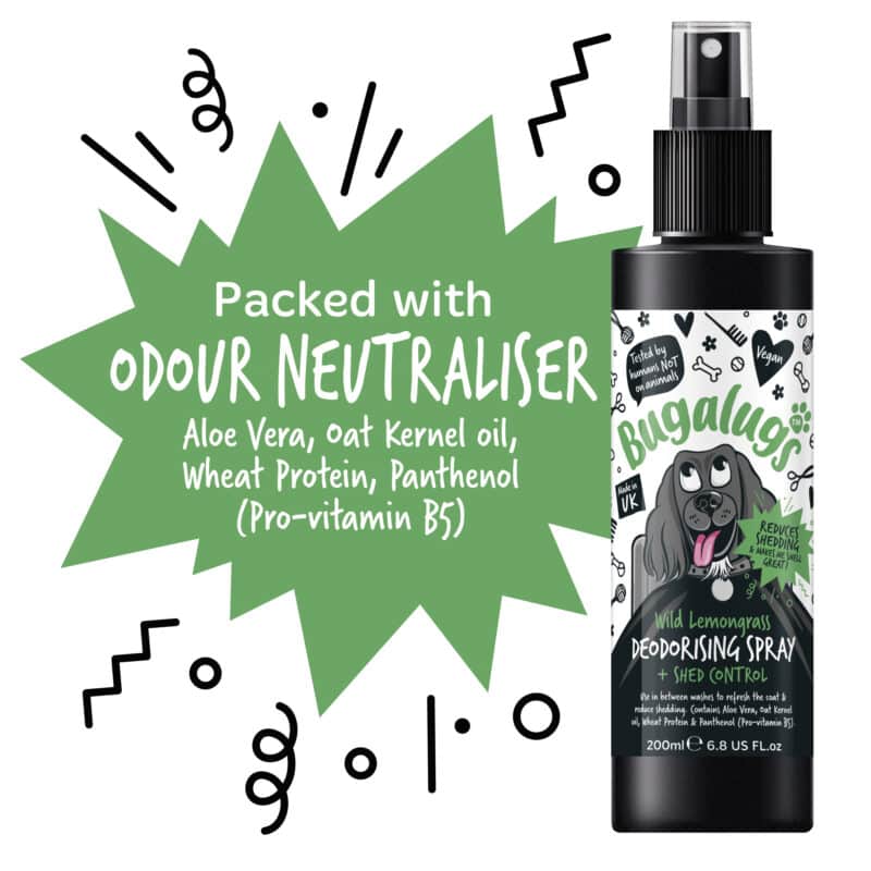Bugalugs sprej s ochranou proti pĺznutiu osviežuje srsť a obsahuje neutralizátor zápachu, ktorý pachy skutočne odstraňuje, namiesto toho, aby ich len prekrýval. Srsť ostáva čistá, hebká a neodolateľne voňavá.