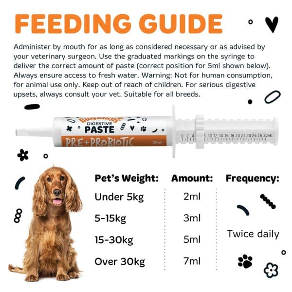 Pasta nielen spevňuje stolicu, ale podporuje aj črevnú sliznicu pre pohodlné vyprázdňovanie. Vďaka praktickému aplikátoru v striekačke je podávanie jednoduché a čisté – či už priamo do úst, alebo zamiešané do krmiva. Vyrobené vo Veľkej Británii z bezpečných a overených surovín.