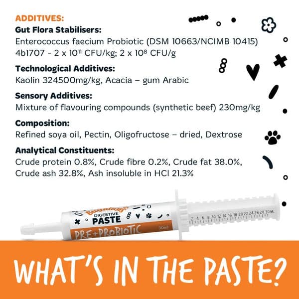 Bugalugs Pre+Probiotická tráviaca pasta poskytuje podporu trávenia pre psov a mačky pri náhlej riedkej stolici, čím pomáha udržiavať zdravú rovnováhu črevných baktérií po tráviacich ťažkostiach.