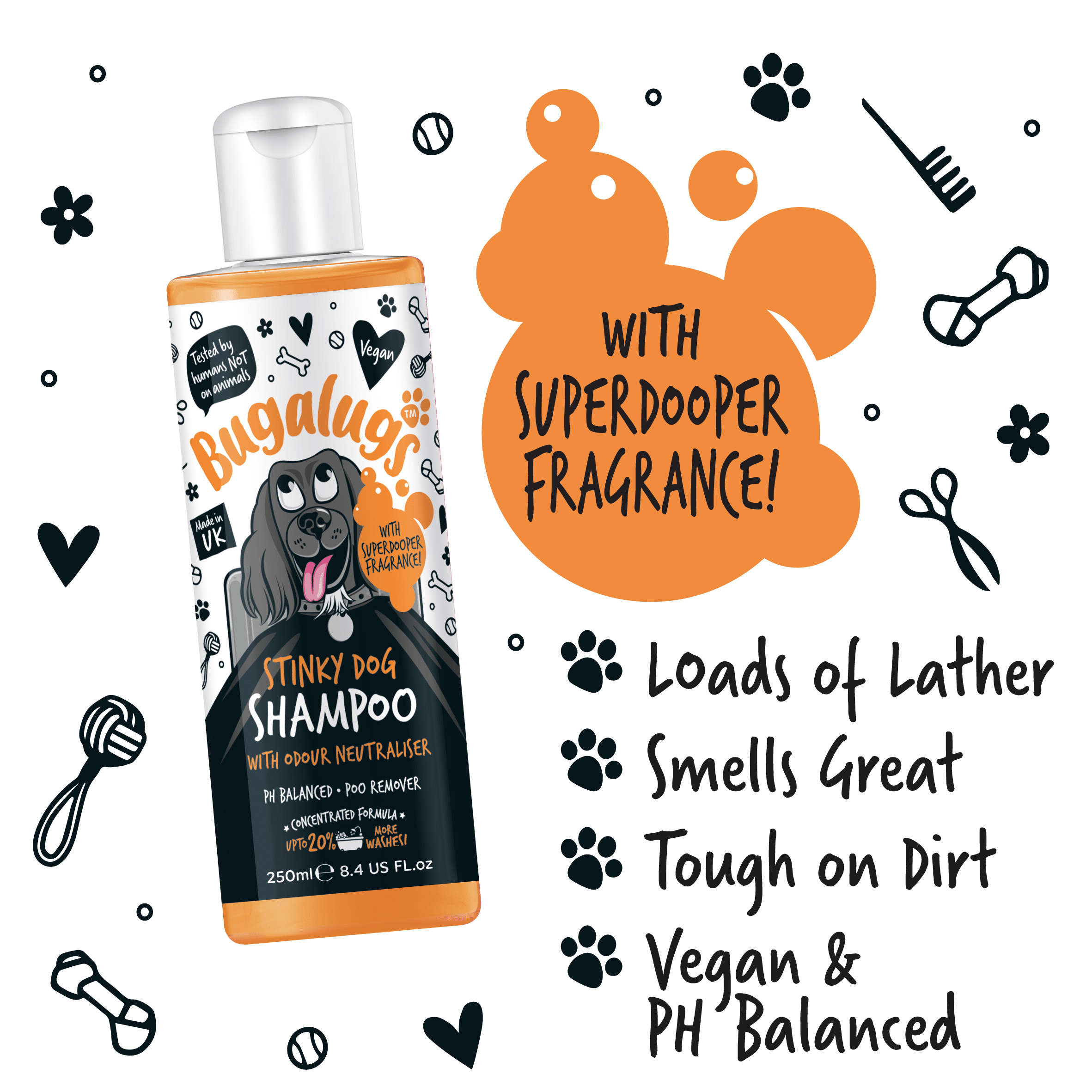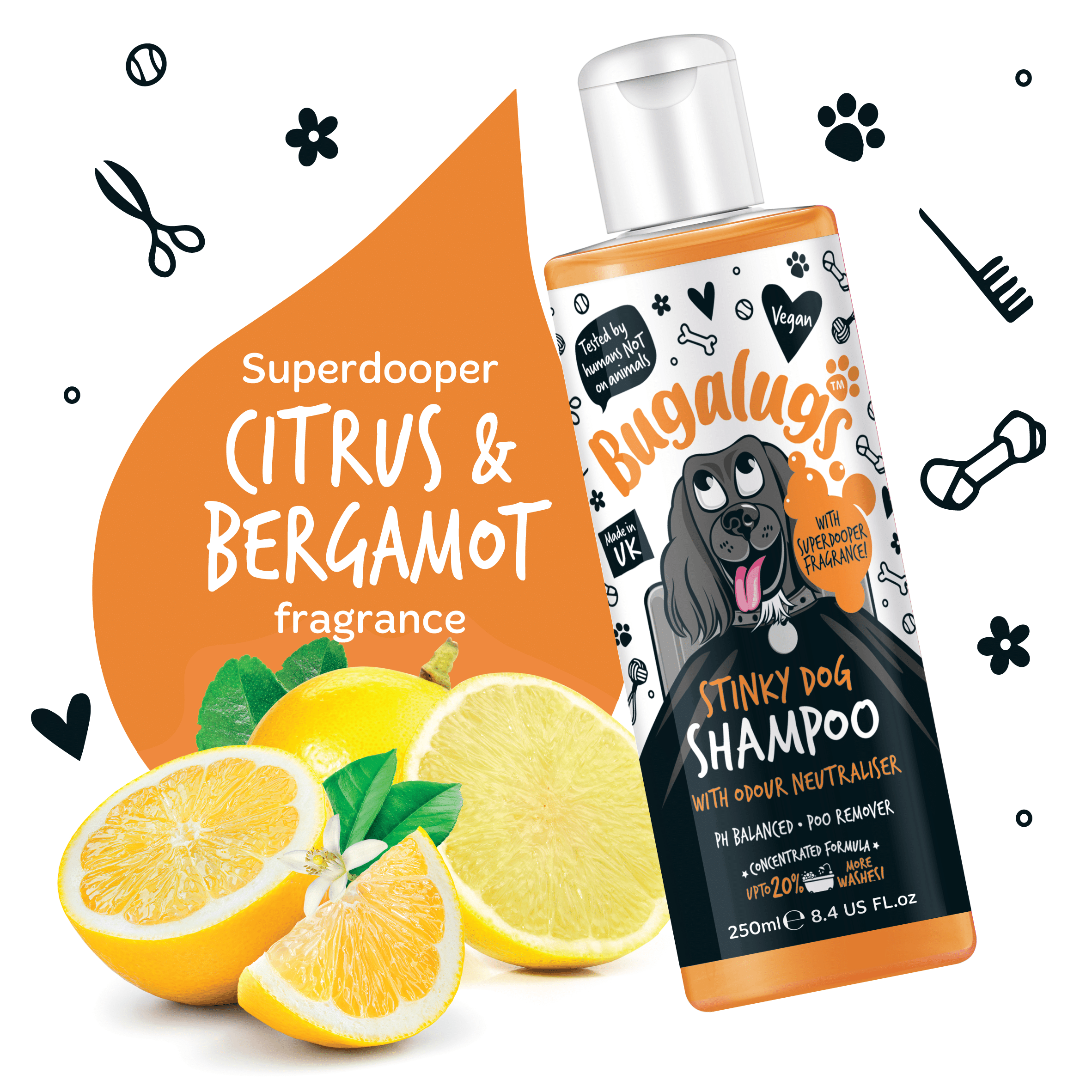 Bugalugs Stinky Dog šampón pre páchnucich psov obsahuje neutralizátor zápachu, ktorý eliminuje nežiadúce pachy a zanecháva dlhotrvajúcu sviežu vôňu citrusov a bergamotu.